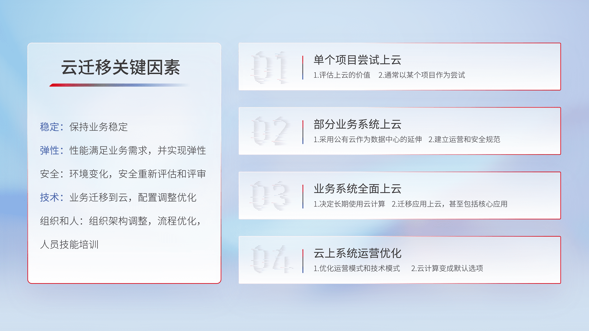 结合实际业务,,从规划设计、、云平台选型、、、云原生改造、、、、数据迁移、、集成交付,,,迁移全过程为客户识别最佳上云路径,,,做好风险识别管理,,,,设计网络架构、、身份权限、、安全审计合规、、操作审计、、、、日志审计、、、、监控告警策略、、多站点容灾设计等,,对云上基础设施进行整体规划,,提升IT治理水平,,,以满足弹性、、、高可用、、、、高性能的需求。。。。