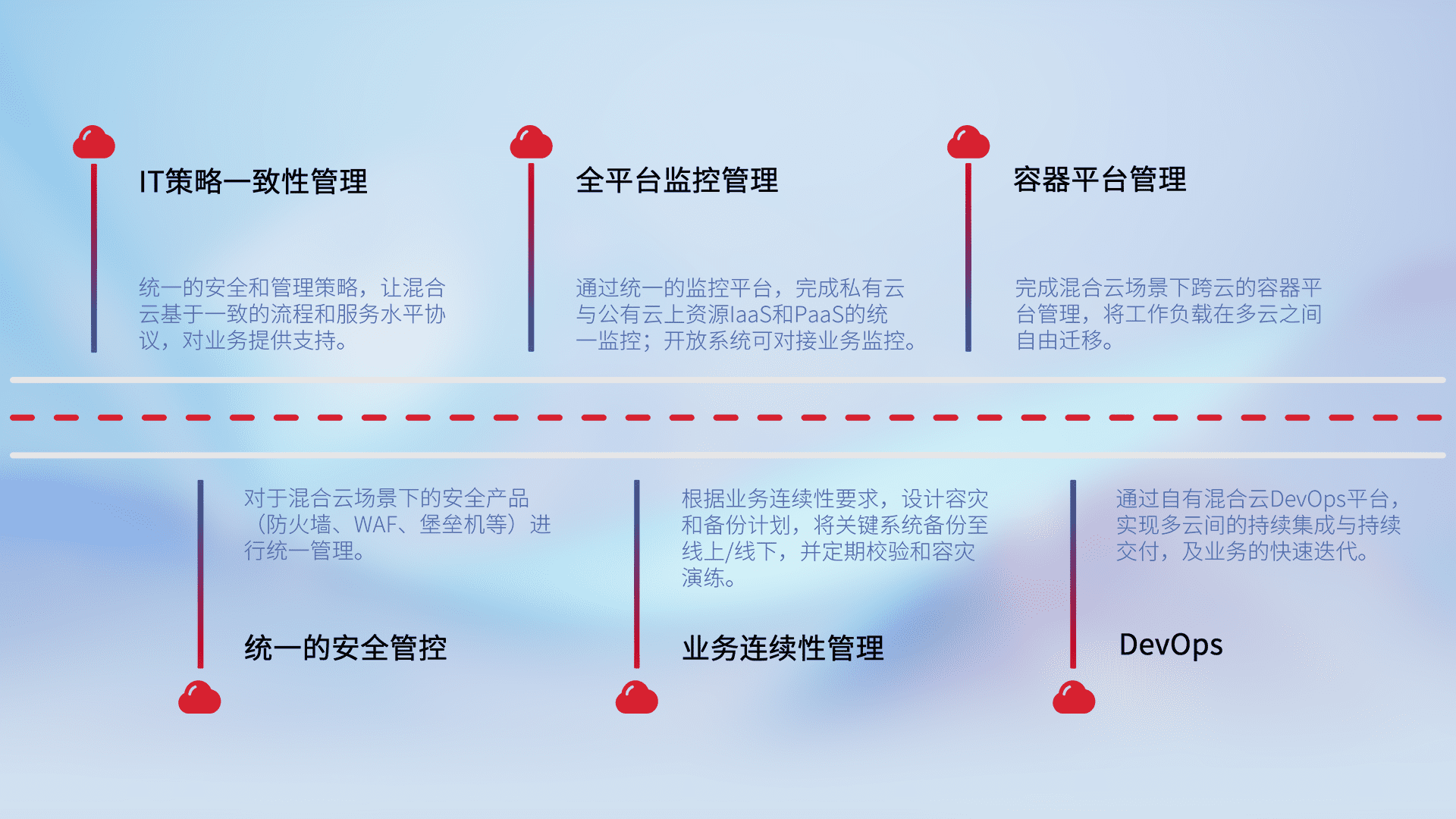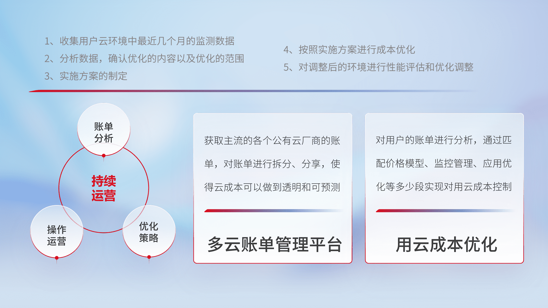 通过多云纳管,,,以统一的资源数据模型把客户的云资源进行抽象和封装,,,,进而实现对多云资源的统一操作,,,,保障云资源管理的可靠性、、稳定性与可用性。。。。量身定制化运维内容,,,配置、、开发运维、、、、补丁管理、、备份、、、、监控、、认证和访问管理、、、审计和日常巡检等,,保障在用云过程中的可靠度,,,,稳定度以及高可用率。。。