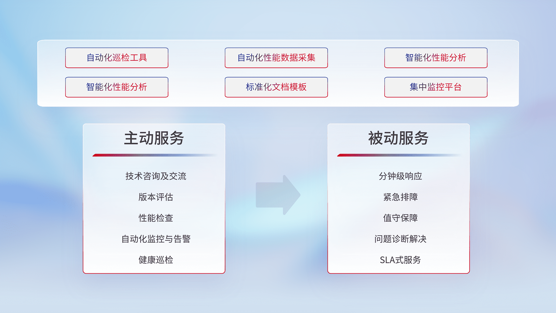 智能化工具和标准化文档,,,,保障服务质量,,提供主动服务(包含技术咨询、、、、版本评估、、、、性能检查、、、、自动化监控与告警、、、、健康巡检)和被动服务包含(分钟级响应、、、紧急排障、、、、值守保障、、、、问题诊断解决、、SLA服务)。。。。